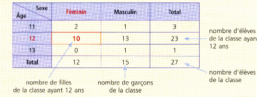 Le tableau à double entrée ci-dessous donne la répartition des élèves d'une classe selon deux types d'informations : leur sexe et leur âge.