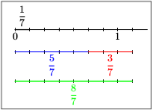 \( \dfrac{5}{\color{red}{7}}+\dfrac{3}{\color{red}{7}}=\dfrac{5+3}{\color{red}{7}}=\dfrac{8}{\color{red}{7}}\) Cinq septièmes plus trois septièmes est égal à huit septièmes. | \(\dfrac{5}{\color{red}{7}}-\dfrac{3}{\color{red}{7}}=\dfrac{5-3}{\color{red}{7}}=\dfrac{2}{\color{red}{7}}\) Cinq septièmes moins trois septièmes est égal à deux septièmes. |